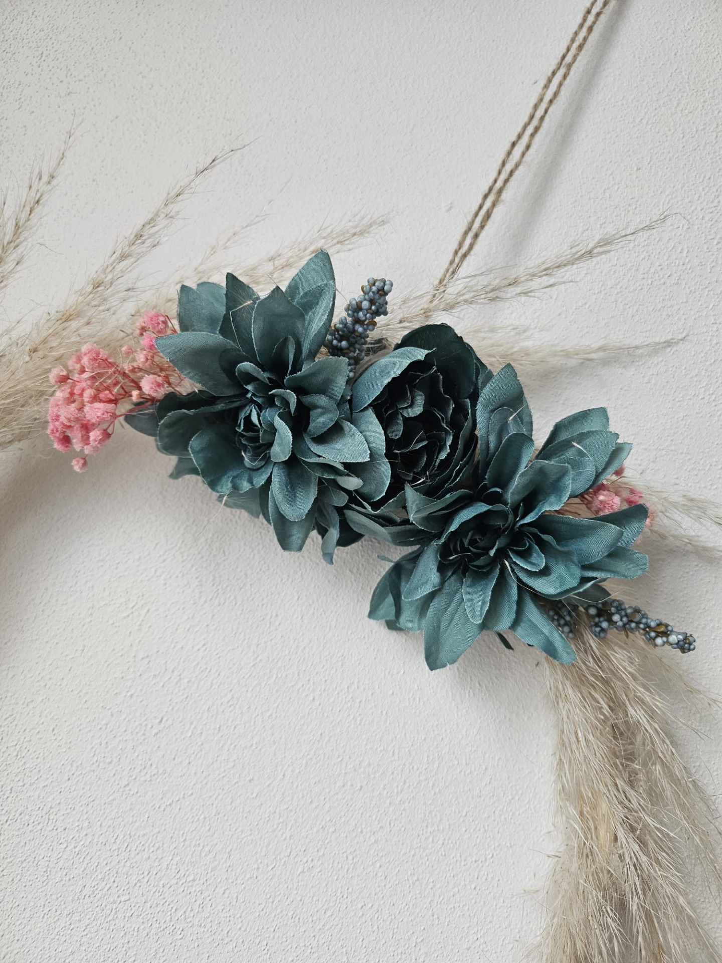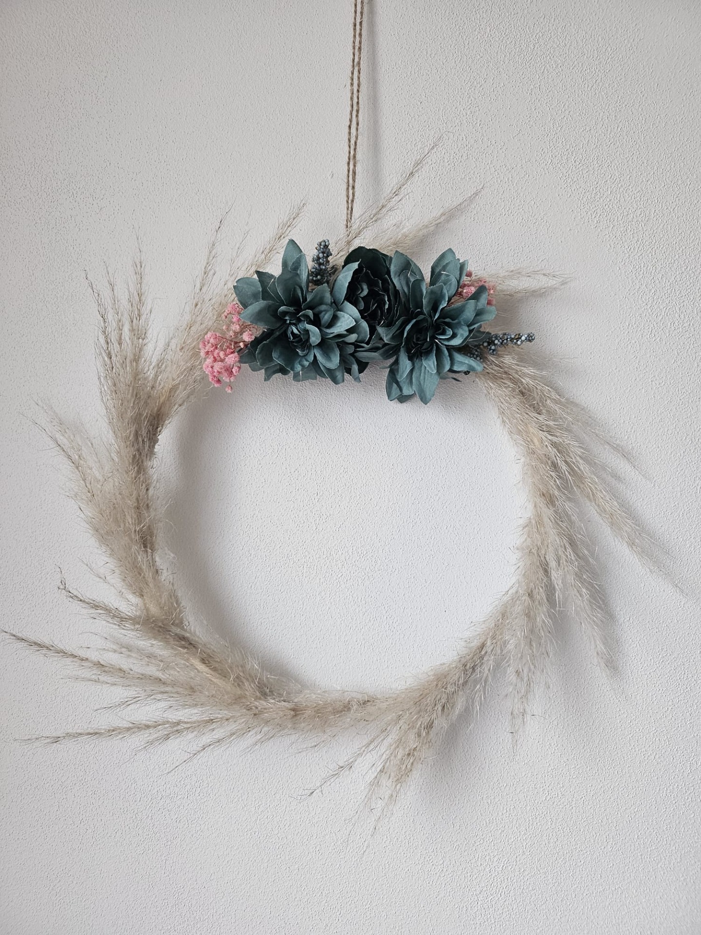 Přírodní elegance v jemném a harmonickém provedení. Tento věnec kombinuje sušenou trávu s květinami, díky čemuž působí vzdušně, lehce a velmi vkusně. Skvěle se hodí do interiéru i na dveře, kde vytvoří útulnou a klidnou atmosféru. Vneste do svého domova kousek přírody a jemné krásy.